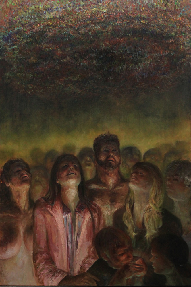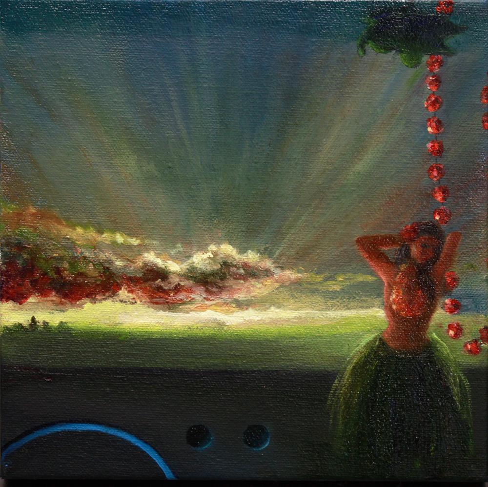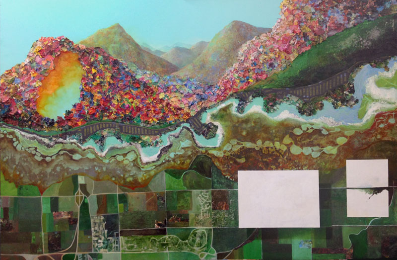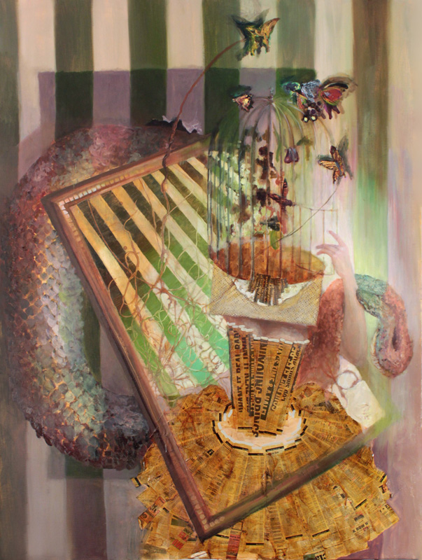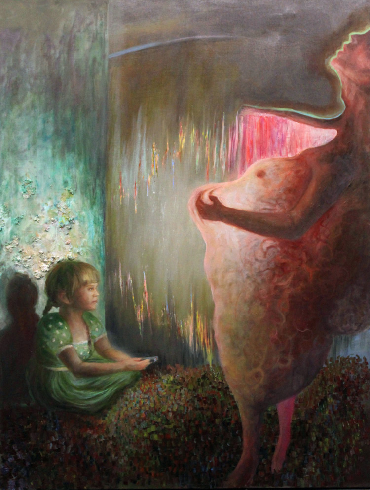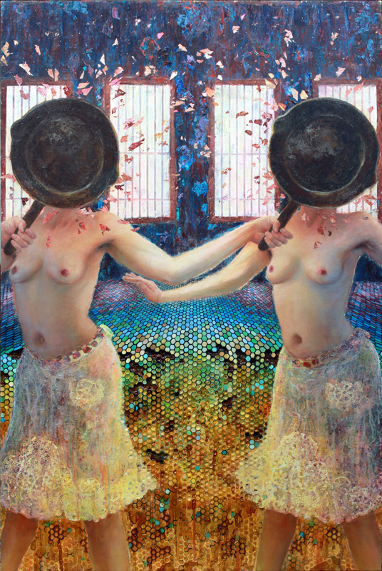 Purple Mountains Majesties.  Oil on Paint Chips on Canvas. Ophelia.  Oil and Collage on Canvas. Pancakes.  Mixed Media on Panel. She's Got the Whole World.  Oil and Paint Chips on Canvas. Tune Out. Oil on Canvas.