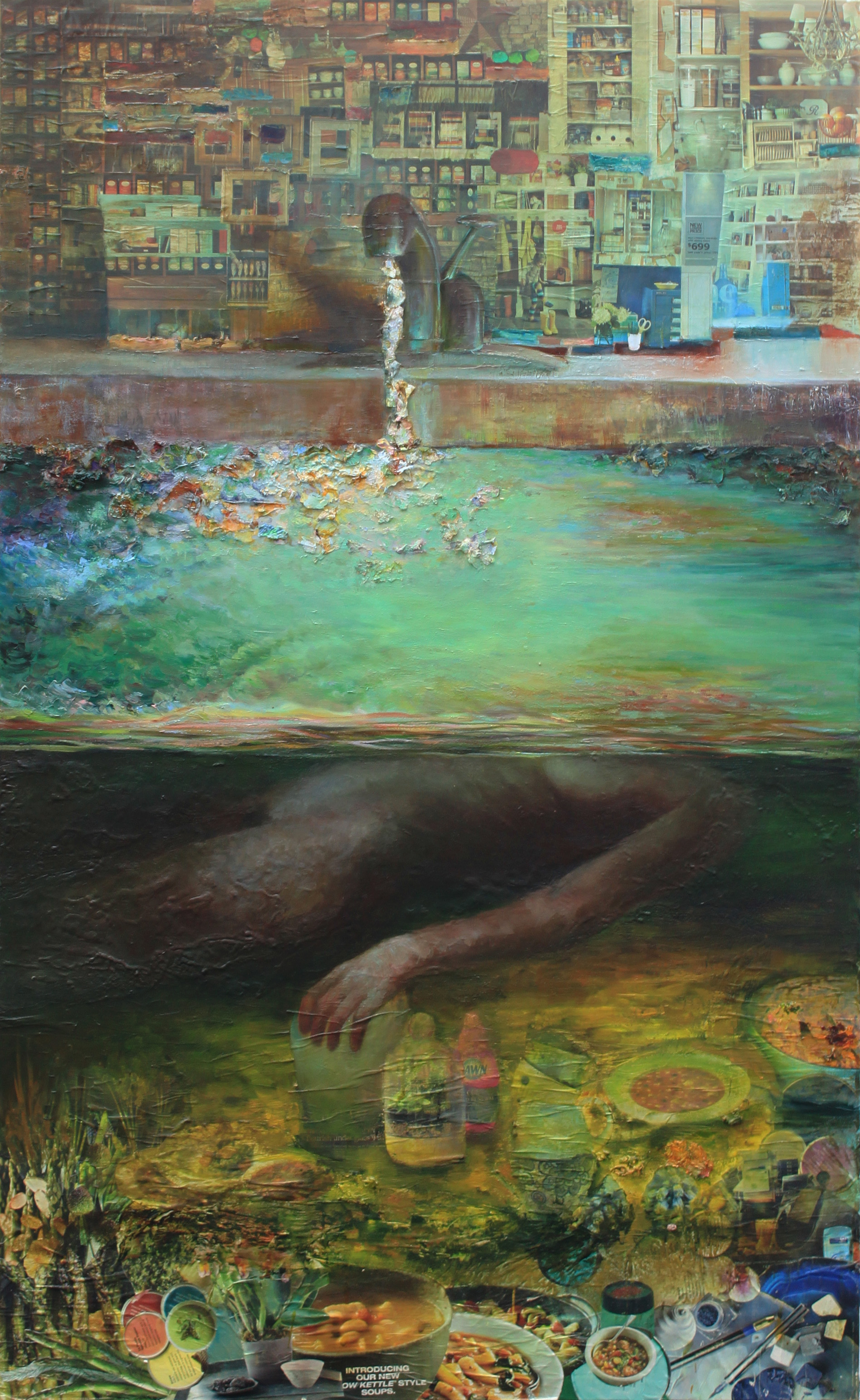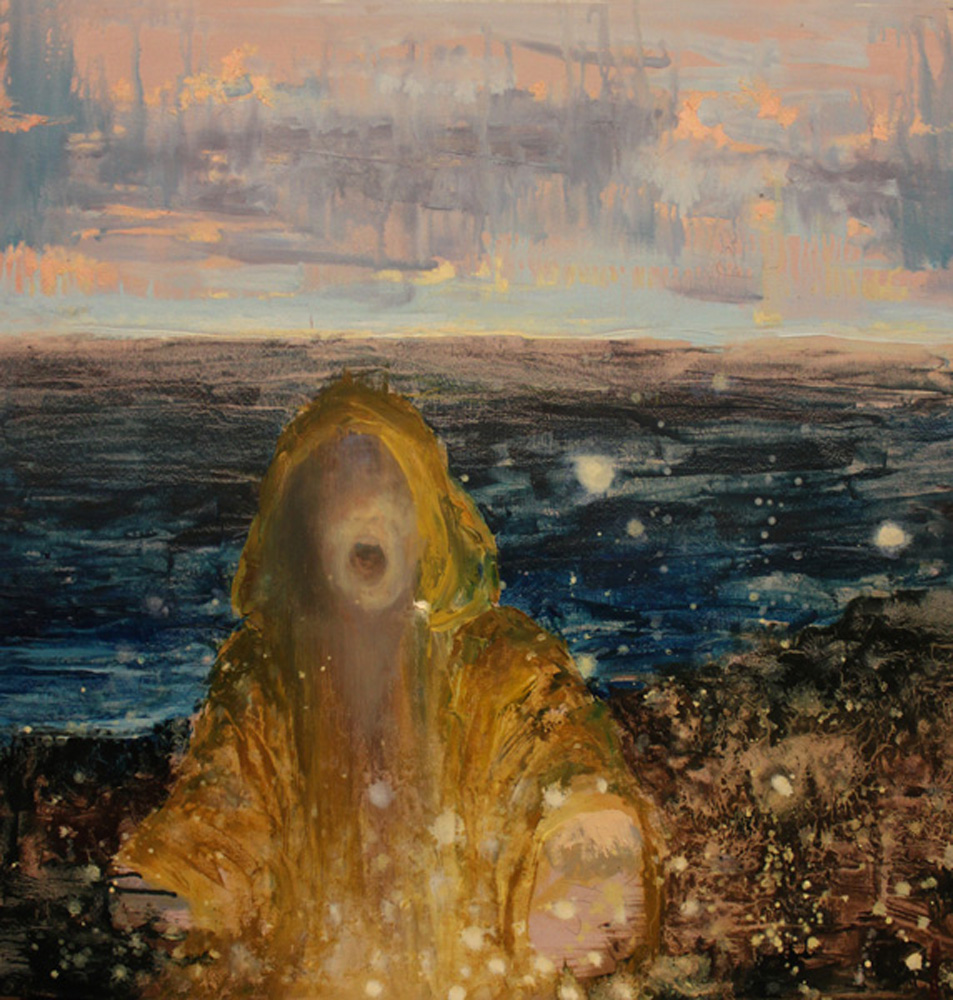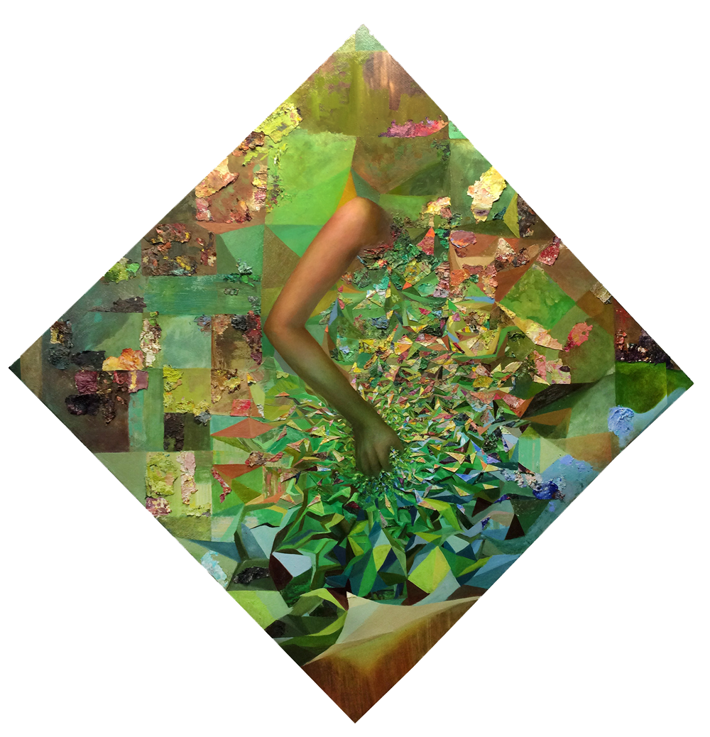 Purple Mountains Majesties.  Oil on Paint Chips on Canvas. Ophelia.  Oil and Collage on Canvas. Pancakes.  Mixed Media on Panel. She's Got the Whole World.  Oil and Paint Chips on Canvas. Tune Out. Oil on Canvas.