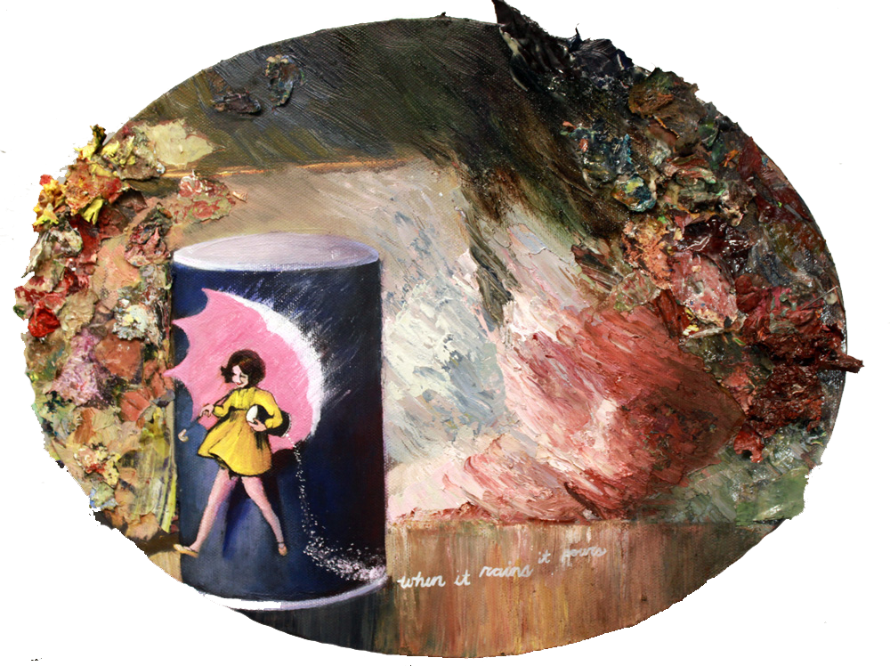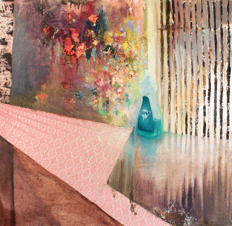 When it Rains, it Pours.  Oil and Acrylic on Canvas. Hula.  Acrylic on Canvas. Damn.  Oil and Lace on Canvas. Lone Wolf.  Oil on Fabric. Birdcage.  Oil on Canvas.