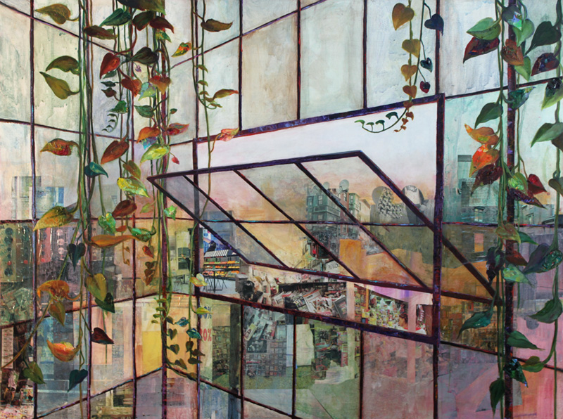 Kid. Charcoal, Marker, and Oil on Canvas. Burn.  Oil on Canvas. Lightening Bugs.  Oil on Panel. Woman in Car. Oil on Fabric. Brooklyn Window.  Collage and Acrylic on Canvas.